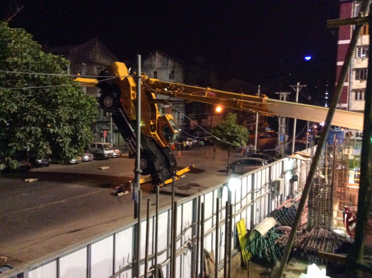 There was a source from Myanmar that a 70 tonne rough terrain crane, Kato SR700L has toppled outside of Sule Trader Square Construction site. No news about any injury during the crane toppled but there was many people watching just by the side of the road.