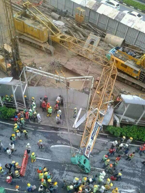 I have received a photo this afternoon from one of my friends that one of the crawler crane working at a construction site neat Telok Ayer Market has toppled and partial of the main boom has fallen onto the main road as shown in the picture.